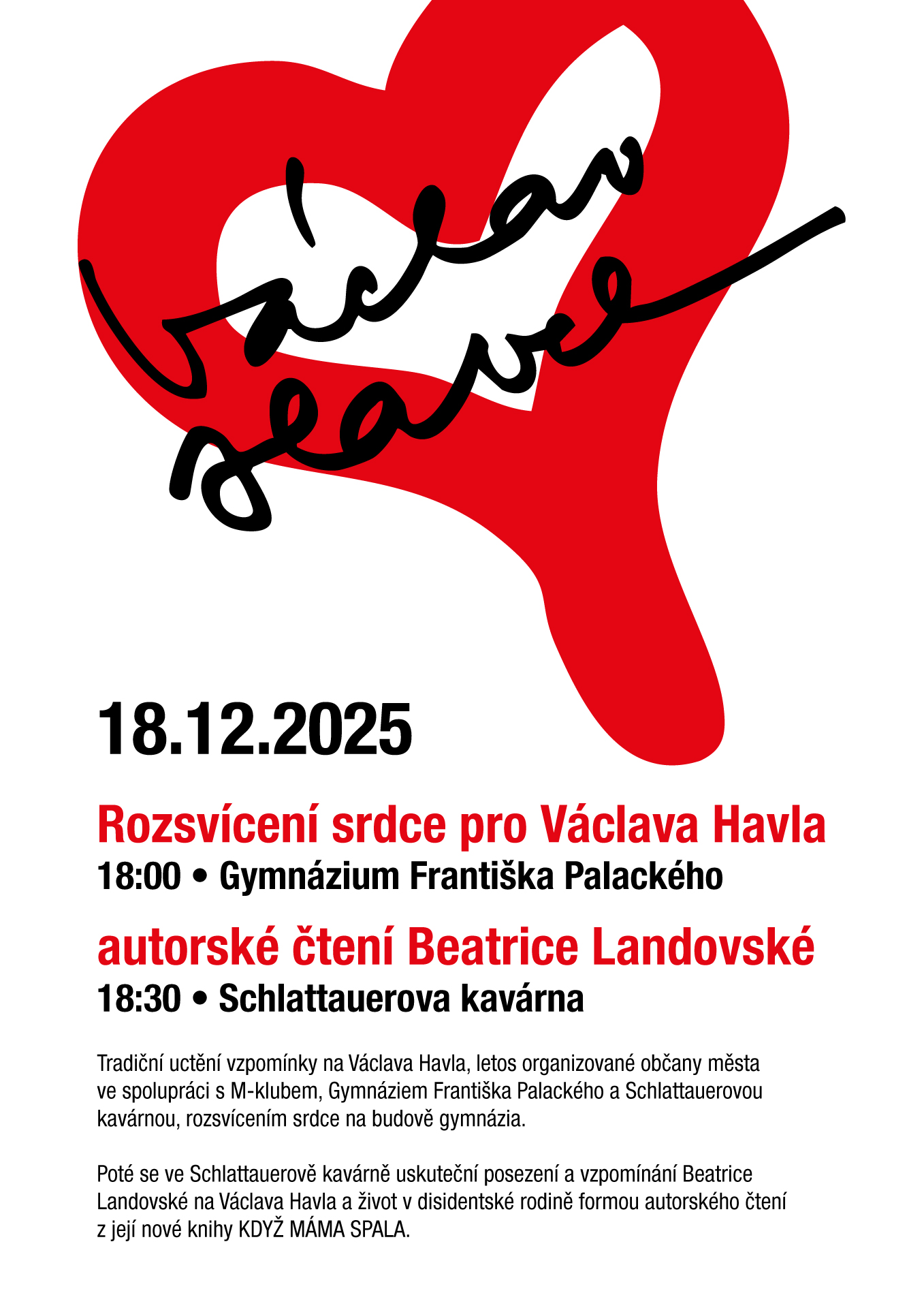 Tradiční uctění vzpomínky na Václava Havla, letos organizované občany města ve spolupráci s M-klubem, Gymnáziem Františka Palackého a Schlattauerovou kavárnou, proběhne 18. 12. od 18 hodin rozsvícením srdce na budově gymnázia.