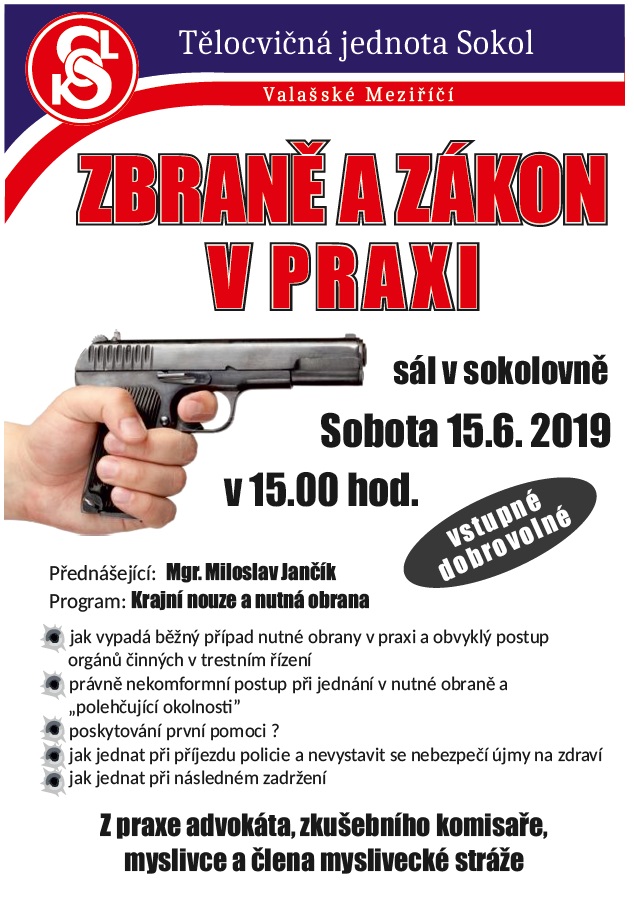 15.6.2019 Sokolovna sál v 15:00 hodin Zbraně a zákon v praxi, Krajní nouze a nutná obrana. Z praxe advokáta, zkušebního komisaře, myslivce a člena myslivecké stráže. Vstupné dobrovolné.